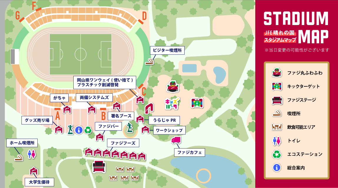 ※ビジターグッズを着用できるエリアは、メインミックス指定席、バックビジター指定席、ビジター自由席です。2024シーズンと異なっておりますのでご注意ください。 ※『ファミリーキッズエリア』はスタジアム南側の芝生エリアで、以下の席種の方が入場可能です。 入場可能チケット:FAGIシート、SS指定席、S(北)指定席、S(南)指定席、SA指定席、ホーム応援エリア、メインミックス指定席