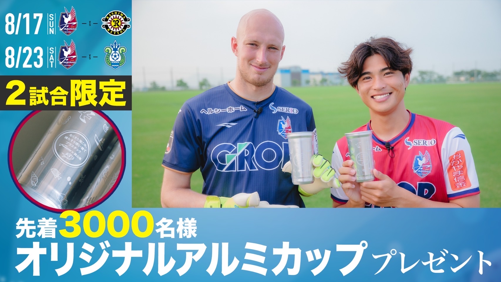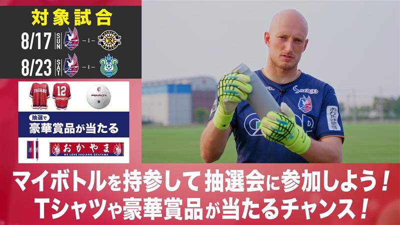 8月17日柏戦、8月23日湘南戦にて、マイボトルをご持参いただいた方を対象に、ファジアーノ岡山の公式グッズなどが当たるガラポン抽選会を各試合先着約500名様を対象に行います。 ※以下1試合毎の提供数量です 試合当日は、スタジアム前広場の「ワンウェイ(使い捨て)プラスチック削減啓発」ブースにマイボトルを持参してお越しください。 特賞 PENALTYサインボール(選手サイン入り):2個 1等 ホッケーシャツ:10枚 2等 タオルマフラー:20枚 3等 ボールペン:70本 参加賞 メモ帳(岡山県ノベルティ):400個