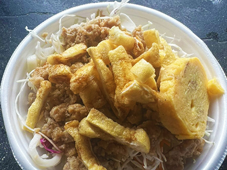 ハワイの定番ランチ、ハンバーグに卵、特製ソースをトッピング!
