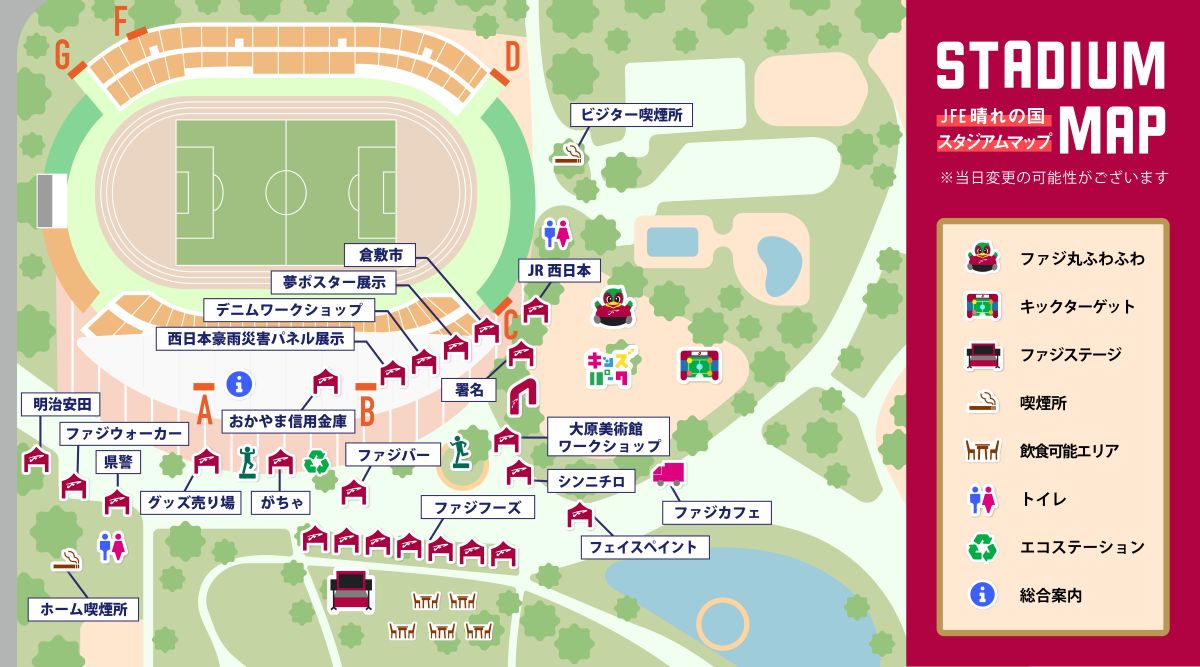 ※ビジターグッズを着用できるエリアは、メインミックス指定席、バックビジター指定席、ビジター自由席です。2024シーズンと異なっておりますのでご注意ください。 ※『ファミリーキッズエリア』はスタジアム南側の芝生エリアで、以下の席種の方が入場可能です。 入場可能チケット:FAGIシート、SS指定席、S(北)指定席、S(南)指定席、SA指定席、ホーム応援エリア、メインミックス指定席