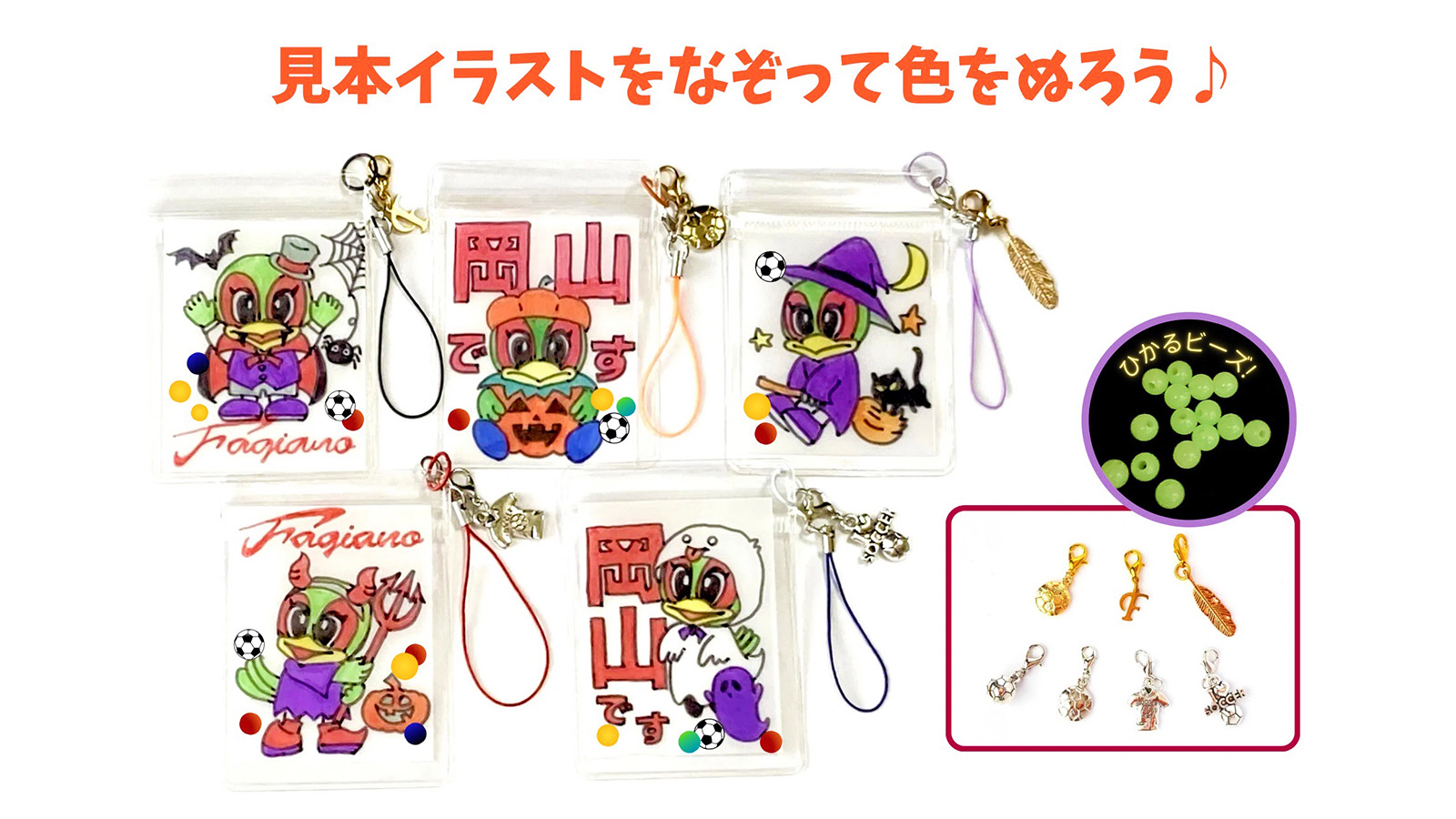 見本イラストを専用シートに写して自由に色を塗りましょう! 光るビーズやサッカービーズを入れて、オリジナルのハロウィンストラップが完成です! 小さなお子さんから大人の方まで大歓迎! 思い出に残るハロウィンストラップを作りましょう! 【価格】ストラップ本体 600円 ※オプションチャーム +300円 【協力】さちやワークショップ