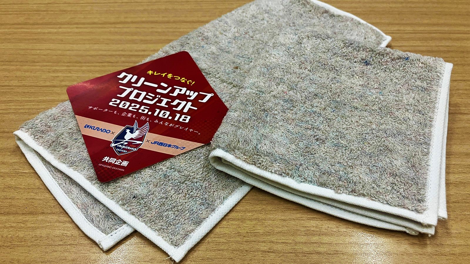 この日はクラボウ・JR西日本・ファジアーノ岡山3社合同で、「キレイをつなぐ!クリーンアッププロジェクト2025」を行います。(※) また、当日はJR岡山駅改札内に特別ブースを設け、イベント記念のバッジと特製カードのセットを先着400名様に無償で配布しております。特製カードをスタジアム前広場のクラボウブースにお持ちいただき、裏面のクイズに正解された方には、クラボウのアップサイクル技術を使った「L∞PLUS(ループラス)タオルハンカチ」をプレゼントいたします。 ※イベント内容:3社の有志メンバーによるJR岡山駅周辺の清掃活動 【場所・時間】 ・JR岡山駅改札内 特別ブース (11:00~12:00) バッジ&特製カードを配布 ・スタジアム前広場 クラボウブース(11:00~15:00) タオルハンカチを配布 *どちらも、配布物がなくなり次第終了
