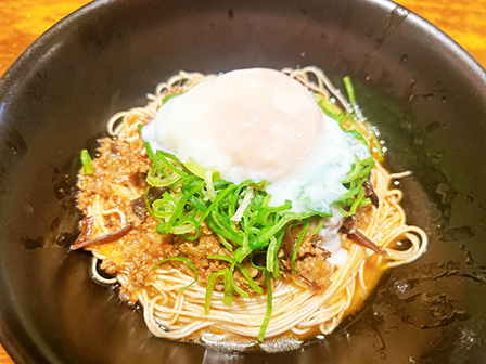 ピリッと山椒の効いた肉味噌に大葉とキューリが絶妙に合う逸品。温玉との相性も◯