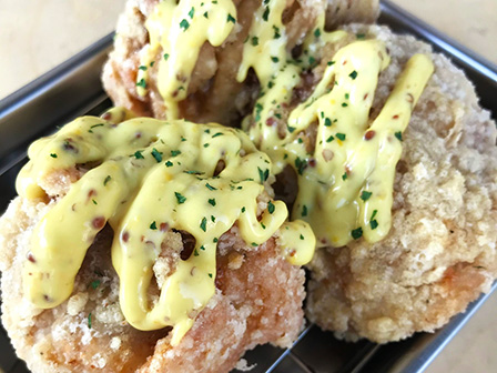 サクッとジューシーなナゲットに、明太マヨをトッピング。手が止まらないおいしさ!