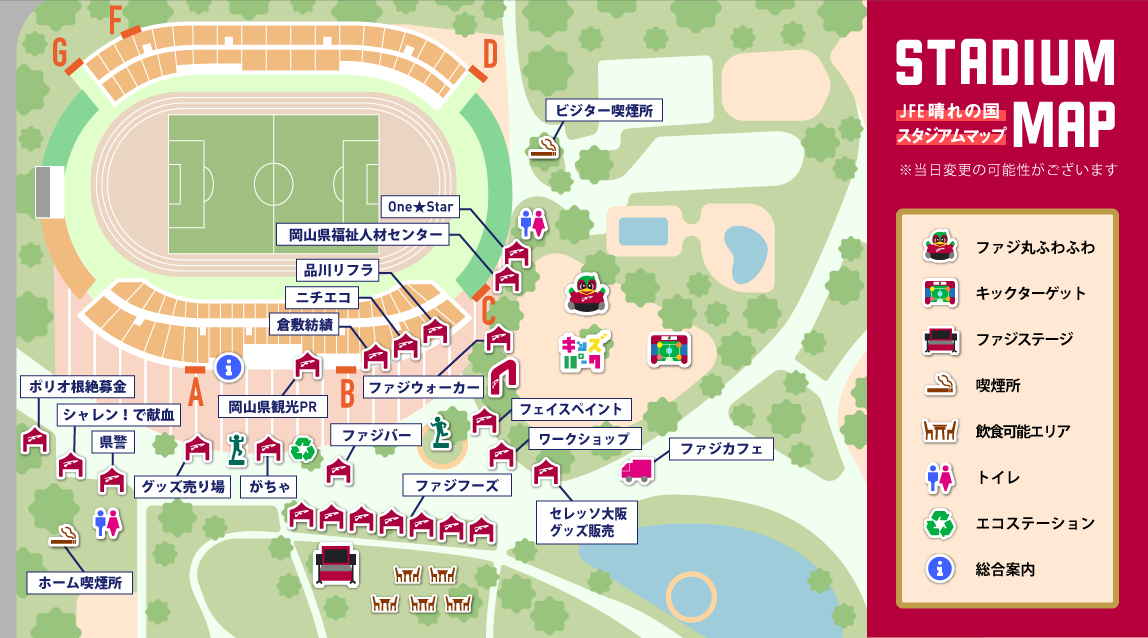 ※ビジターグッズを着用できるエリアは、メインミックス指定席、バックビジター指定席、ビジター自由席です。2024シーズンと異なっておりますのでご注意ください。 ※『ファミリーキッズエリア』はスタジアム南側の芝生エリアで、以下の席種の方が入場可能です。 入場可能チケット:FAGIシート、SS指定席、S(北)指定席、S(南)指定席、SA指定席、ホーム応援エリア、メインミックス指定席
