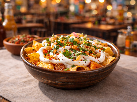 チップスにチーズ、お肉、ワカモレをのせて温めたメキシカンの料理。