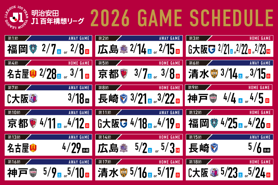 2026年2月から6月まで開催する明治安田J1百年構想リーグについて、地域リーグラウンドWESTグループの各節対戦カードが決定しましたので、お知らせいたします。