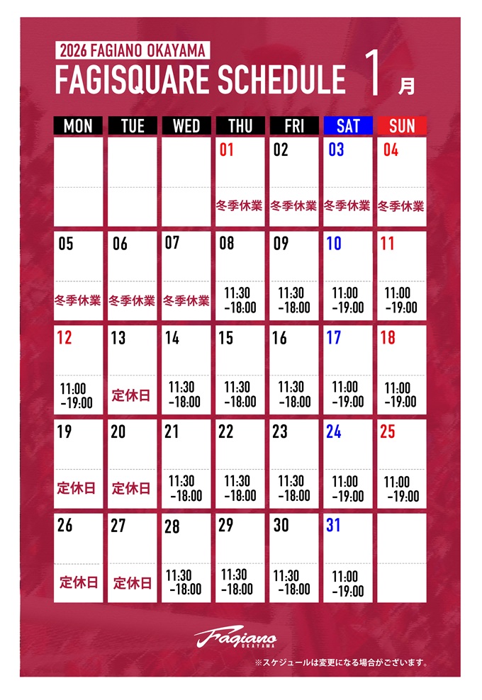1月のファジスクエア営業時間をお知らせいたします。 年始は8日より営業!皆さまのご来店を心よりお待ちいたしております。※2025年12月22日時点のスケジュールです。変更となる可能性がございます。