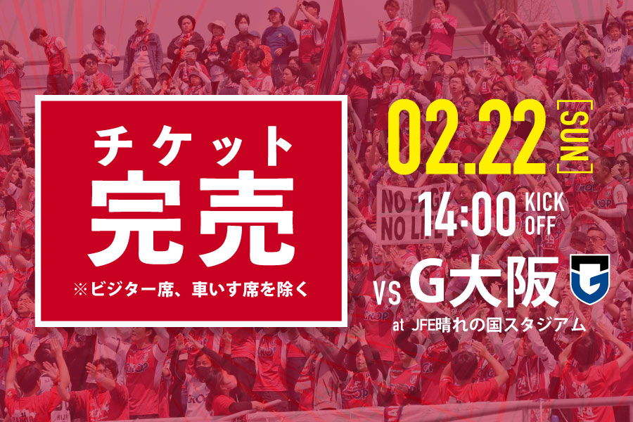 JFE晴れの国スタジアムで2月22日に開催するガンバ大阪戦において、ホームエリアのチケットは本日完売いたしました(車いす席を除く)。