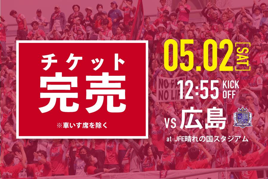 JFE晴れの国スタジアムで5月2日に開催するサンフレッチェ広島戦において、車いす席を除く全席種のチケットは本日完売いたしました。