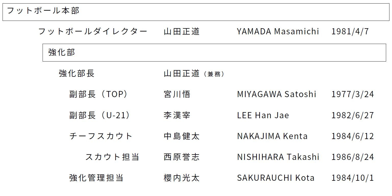 百年構想リーグの強化部体制について、下記のとおりお知らせいたします。 新設のフットボールダイレクター(FD)に山田正道が就任し、強化(TOP・U-21)ならびに育成部門を担当領域といたします。 なお育成部門につきましては、後日改めて発表いたします。