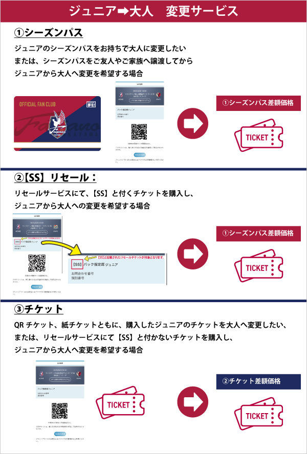 ジュニアのシーズンパス、チケット(リセールでの購入を含む)をお持ちの方で、お子様が試合に来られない際、試合当日に大人券との差額のお支払いで大人の方がご入場が可能となるジュニア→大人の変更サービスについてご案内いたします。